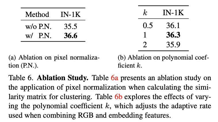 이미지 간 similarity matrix를 계산할 때 각 patch의 평균을 0, 표준편차를 1로 정규화하는 pixel normalization 기법을 도입하였다. 그 결과, Table 6a에 나타난 바와 같이 모델의 성능이 +1.1% 향상되었다.