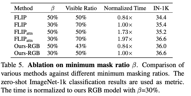 FLIP 방식과 동일한 평균 마스킹 비율을 갖도록 minimum mask ratio β를 설정하여 우리 방식의 성능을 검증하였다(Table 1, 2, 5 참고). 여기서 우리 방법에서 cutoff ratio는 최소 마스킹 비율을 의미하며, 실제로 모델이 본 patch의 비율은 visible ratio로 나타낸다. FLIP은 모든 이미지에 대해 일정한 마스킹 비율을 유지한다. 실험 결과, 우리 방법은 FLIP보다 더 적은 patch를 보면서도 zero-shot ImageNet-1K 분류 정확도에서 +1.6%의 성능 향상을 보여주었고, 연산 속도도 FLIP과 유사하게 빠르다. attention 기반 masking 방식도 비슷한 성능을 보이지만 연산 속도가 매우 느리다. 이러한 결과는 cluster 기반 masking이 효과적인 denoising 기법 역할을 한다는 것을 시사한다. 이는 모델이 배경처럼 정보가 적고 caption 단어와 관련 없는 영역(예: 단색 배경)을 쉽게 masking할 수 있게 하여, 더 의미 있는 이미지 콘텐츠에 집중할 수 있도록 해주기 때문이다.