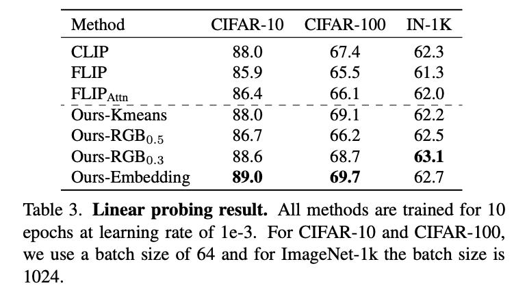 FLIP과 CLIP을 비교했을 때, FLIP은 큰 배치 사이즈에도 불구하고 상대적으로 성능이 낮았다. 저자들은 실험 조건에서 FLIP의 장점이 충분히 발휘되지 못했기 때문일 수 있다고 보며, 이는 ACLIP 연구에서도 유사하게 지적된 바 있다. Attention score를 활용한 masking이 random masking보다는 성능이 좋지만, 여전히 cluster-based masking보다는 떨어졌으며, 일부 benchmark에서는 original CLIP보다도 못한 결과를 보이기도 했다.