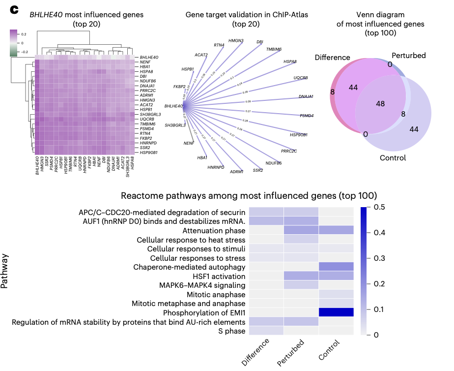 BHLHE40 억제에서도 top20 영향받은 유전자들 중 19개가 BHLHE40 전사인자의 타겟으로 이미 알려진 유전자들이었다. pathway-activation profile 결과도 이 전사인자의 세포 주기 조절에서의 역할을 반영한다.