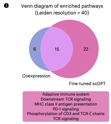 scGPT와 coexpression network간 잡아낸 pathways의 유사점, 차이점도 분석해본 결과(fig.5e), 둘다 15개의 공통된 pathway를 찾아냈고, 이는 cell cycle, immune system과 관련된 pathway이다. scGPT가 coexpression network는 못찾아낸 22개의 pathways를 더 찾아냈는데, 이 중 14개는 면역관련이었다. scGPT는 특히 adaptive immune system, T cell receptor signaling, PD-1 signaling, MHC class II presentation과 같은 pathway를 강조하였는데, 이는 fine-tuning 데이터셋에서 adaptive immune populations가 존재한 것과 일치한다.