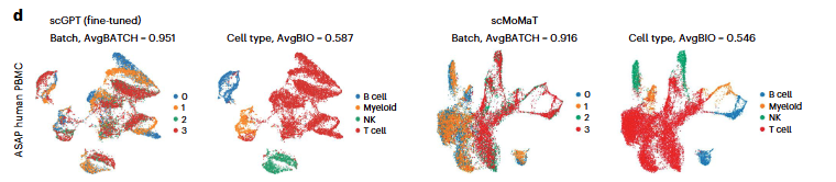 mosaic data-integration setting에서는 샘플이 모든 모달리티를 공유하지 않아 통합이 어렵다. scGPT는 ASAP PBMC 데이터셋(ATAC with select antigen profiling)(4개 배치, 3개 모달리티)에서 scMoMaT 대비 뛰어난 batch correction 성능을 보여주었으며, 특히 B세포, 골수세포, NK세포 그룹에서 효과적이었다. 전체적으로 세포 유형 클러스터링 성능이 우수하고, 다양한 생물학적 보존 지표에서도 안정적인 성능을 나타냈다.