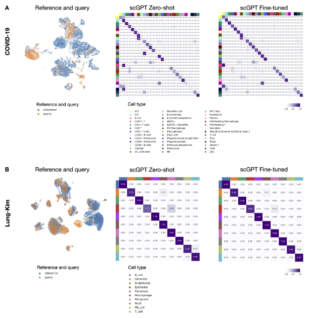추가로, scGPT가 cell type classification 말고도, fine-tuning없이도 unseen query cells를 reference dataset에 잘 proejct시킬 수 있는지를 확인해본 결과, 기존 방법과 비교하여 좋은 성능을 달성했음을 발견하였다.