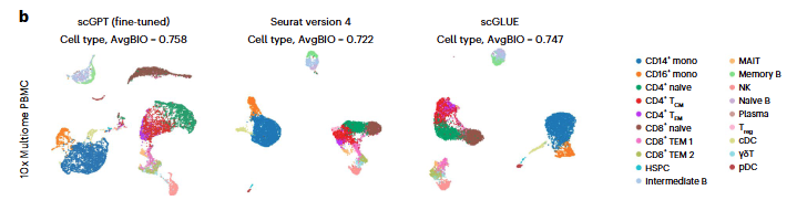 다음으로, BMMCs dataset(paired gene expression + protein abundance)에서 테스트하였는데, 이 데이터셋은 많은 양의 세포(9만개), 12 donors(12 batches), fine-grained sub-group annotations(48cell types)를 포함한다. 그 결과, scGPT가 Seruat(v.4)보다 더 뚜렷한 클러스터 구조를 보여주었다.