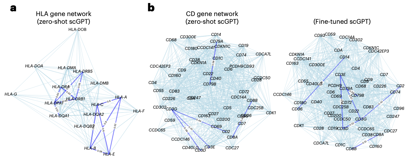추가적으로, scGPT를 immune human dataset에서 fine-tuned하고 이 데이터셋에 존재하는 면역세포 유형에 특이적인 CD 유전자 네트워크를 탐구하였다.(fig.5b)