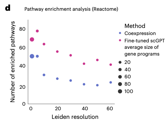 그 결과, scGPT가 모든 클러스터링 해상도(세밀한 정도?)에서 enriched pathways의 수가 coexpression network에 비해 상당히 더 많음이 관찰되었다. 즉, scGPT가 다양한 조건에서 더 많은 '의미있는 생물학적 경로'를 잡아낸다는 것이다. (fig. 5d)