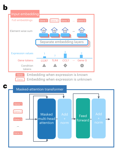 - transformer layers with multi-head attention: generate cell & gene embeddings simultaneously
