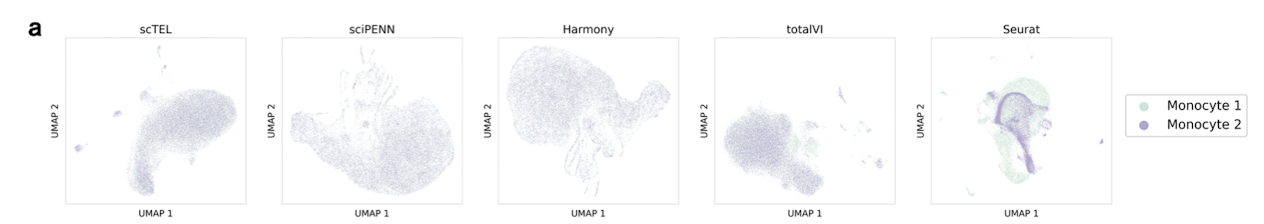 Monocytes dataset: scTEL, sciPENN이 data mixing이 잘 되어있는 것을 볼 수 있음 (batch effect↓)