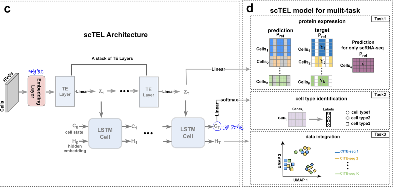 본 논문에서는 transformer에 영감을 받아, transformer encoder layers + LSTM cells 를 결합한 새로운 프레임워크 scTEL을 제안하며, 이는 CITE-seq에서 transcriptomics, proteomic data를 jointly model할 수 있다.