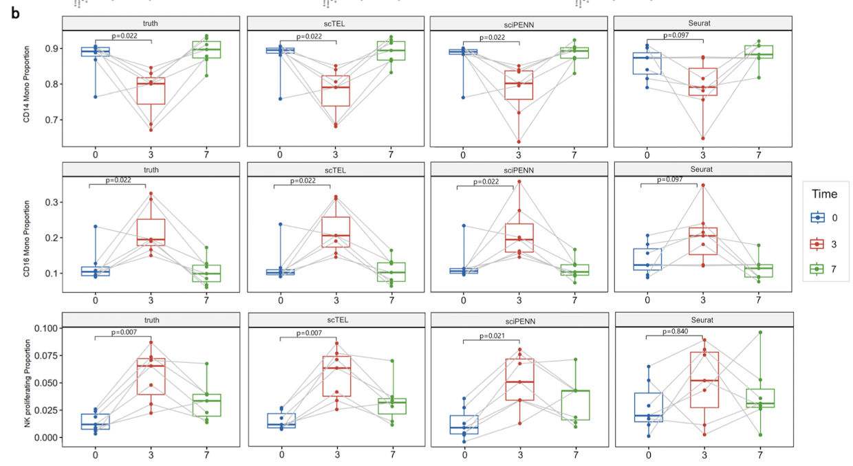 PBMC 데이터셋의 기증자들은 VSV 기반 HIV 백신을 접종받았는데, 접종 직전, 접종 3일 후, 7일 후 세 시점에서 세포 발현 프로파일을 수집하였다. 선행연구에 따르면, CD14 monocytes, CD16 monocytes, NK proliferating 세포가 백신에 뚜렷한 반응을 보인다고 보고되었는데, 시간 경과에 따른 subtypes의 비율 변화 결과, scTEL이 실제 패턴과 가장 유사하게 예측하였다.