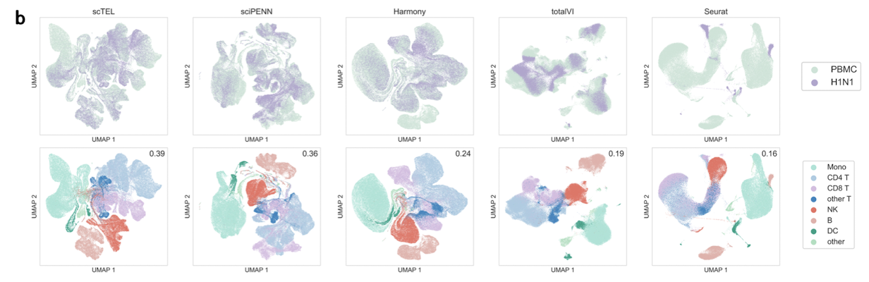 PBMC + H1N1 dataset 통합: 각각 다른 실험실로부터 온 데이터임에도, scTEL에서 데이터들이 잘 mix되어있음; scTEL은 분명하고 뚜렷한 clustering을 유지한 채, 서로 다른 데이터셋을 잘 mix함.