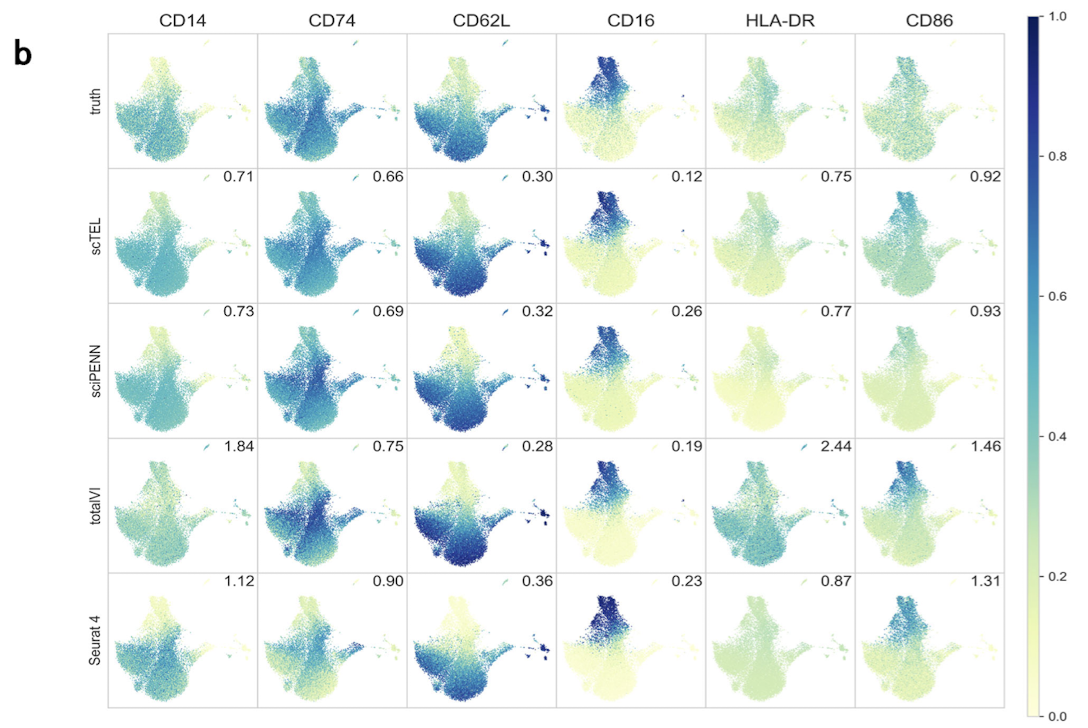 즉, RNA만 보면 cell subpopulation이 잘 안보이는데, 실제 단백질 데이터(true protein)은 cell subpopulation 구분에 매우 효과적임. -> scTEL은 예측한 단백질 발현 패턴이 실제와 거의 유사해서, RNA만 있는 데이터에서도 단백질 발현을 추정, 예측해서 cell subpoluation을 정확히 식별 가능